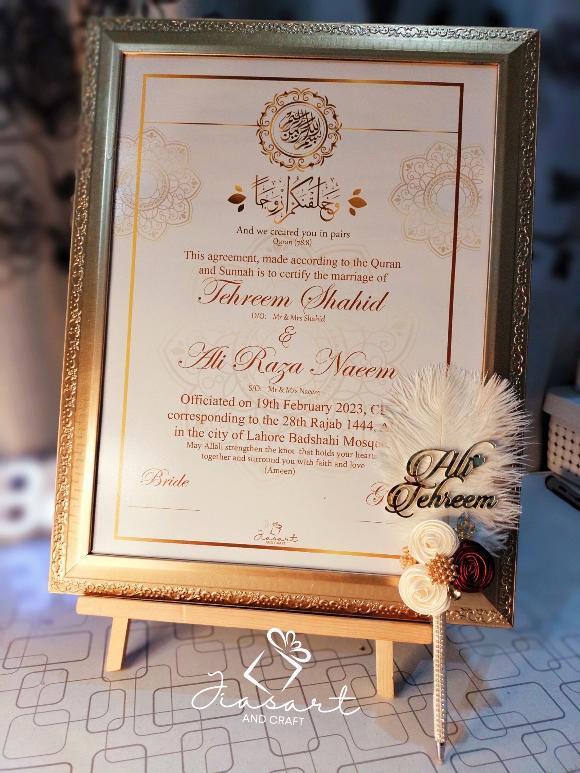Gold Nikkah Nama with Gold Frame A3 with Royal Maroon Pen