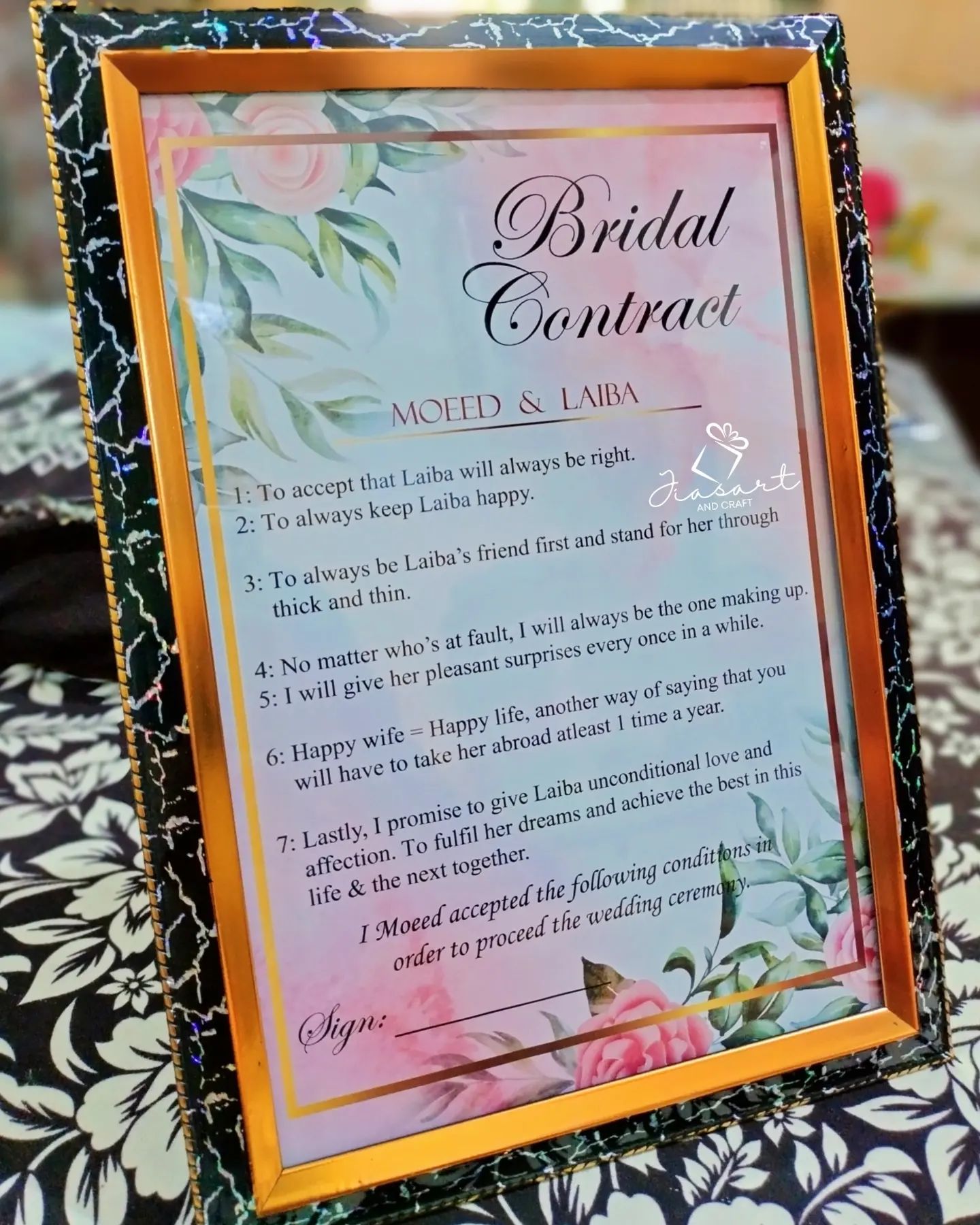 Pink Floral Bridal Contract With Black Gold Frame in A4